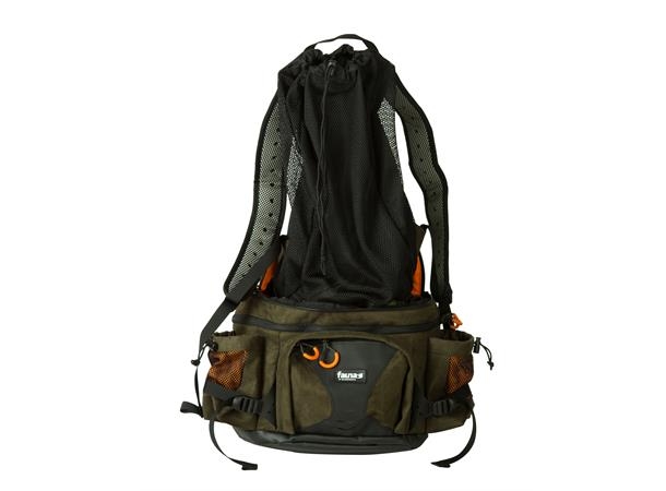 Praktisk hoftebelte med plass til det man behøver til på korte jaktturer. Integrert i vesken ligger et viltnett med bæreremmer, som kan tas ut og rengjøres. Fauna F 12 Hip er produsert i lydløst Fauna-stoff SL450:3 med solide spenner og YKK-glidelåser.