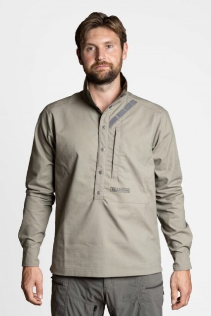 Den er produsert i ripstop-polyester/bomull og er tenkt som et tynt ytterplagg eller et mellomlag som beskytter mot mygg og vind uten å varme mer enn nødvendig, takket være designet med halv knappeåpning og høy krage. Skjortens farge er perfekt kamuflerende i mange miljøer og passer i alle anledninger. Designen med en romslig brystlomme, knapping opp i halsen og skjortknapper i ermer som gjør den til ett allsidig plagg. Med Pullover Shirt er du alltid forberedt og godt kledd for både jakt og hverdag.