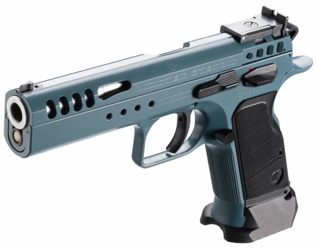 Gren: Standard Class, Felt Single action Ny modell med slående design i teal blue. High capacity- variant. Polygonriflet løp gir topp presisjon og lang levetid, og den forlengede dust coveren gir pistolen en utmerket balanse. Leveres i koffert med 2 ekstra rekylfjærer av ulik hardhet, frontsikte med fiber, pussesett og ekstra magasin i kromfinish med alupad. Løpslengde: 125mm Vekt: 1260g